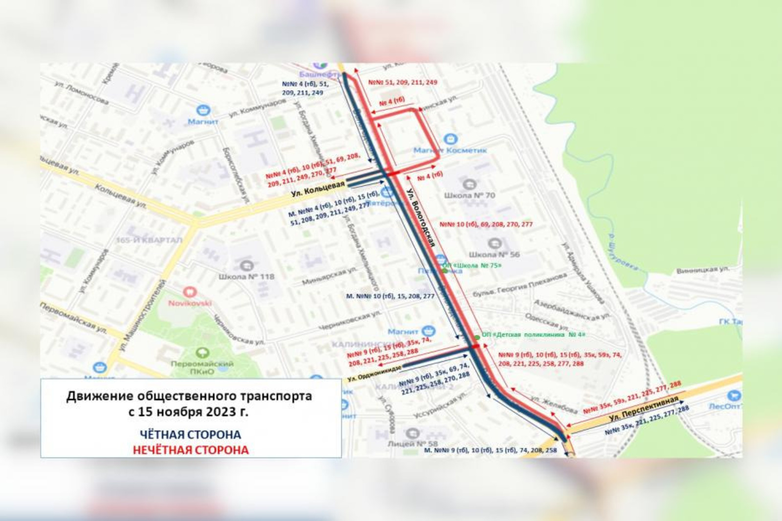 С 15 ноября 2023 г. в Уфе изменится путь следования общественного транспорта, курсирующего по ул. Вологодской, на участке от ул. Коммунаров до ул. Перспективной, с заездом на ост. «Детская поликлиника №4» и «Школа №75». Основные причины – перенос контактных сетей и изменения в схеме организации дорожного движения. В общей сложности это коснется 4 троллейбусных и 13 автобусных маршрутов.