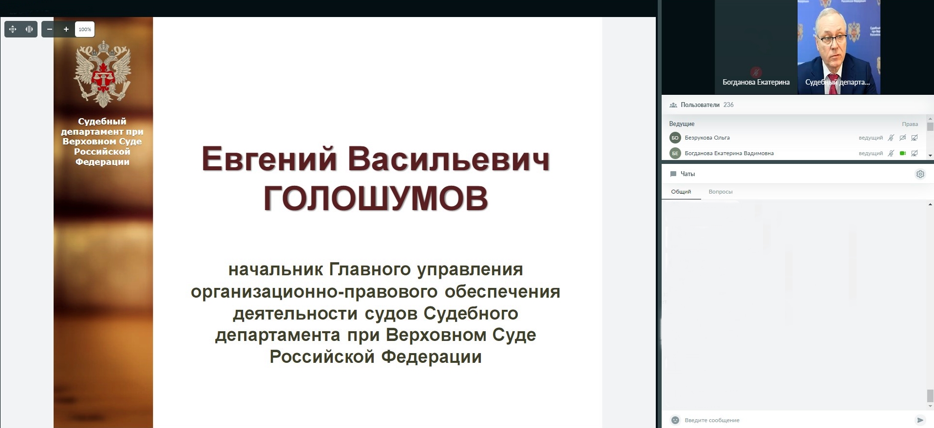 Открыл вебинар начальник Главного управления организационно-правового обеспечения деятельности судов Судебного департамента при Верховном Суде Российской Федерации Евгений Голошумов, который пожелал всем участникам успешной и плодотворной работы.