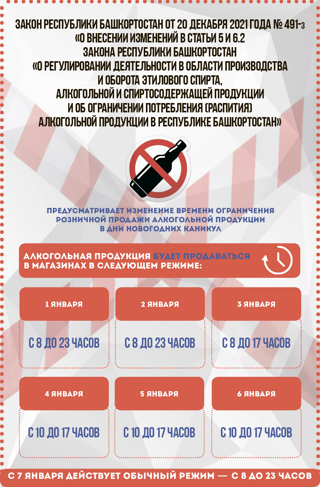 – Режим продажи алкоголя определятся законом «О регулировании деятельности в области производства и оборота этилового спирта, алкогольной и спиртосодержащей продукции и об ограничении потребления (распития) алкогольной продукции в Республике Башкортостан», – сказал спикер республиканского парламента. – Под занавес 2021 года в ранее действовавший порядок были внесены изменения и установлен следующий порядок: 3 января продажа алкоголя в розничных магазинах разрешается с 8 до 17 часов, с 4 по 6 января – с 10 до 17 часов, в остальные дни каникул дополнительных ограничений нет. Этот же порядок действует и в этом году.