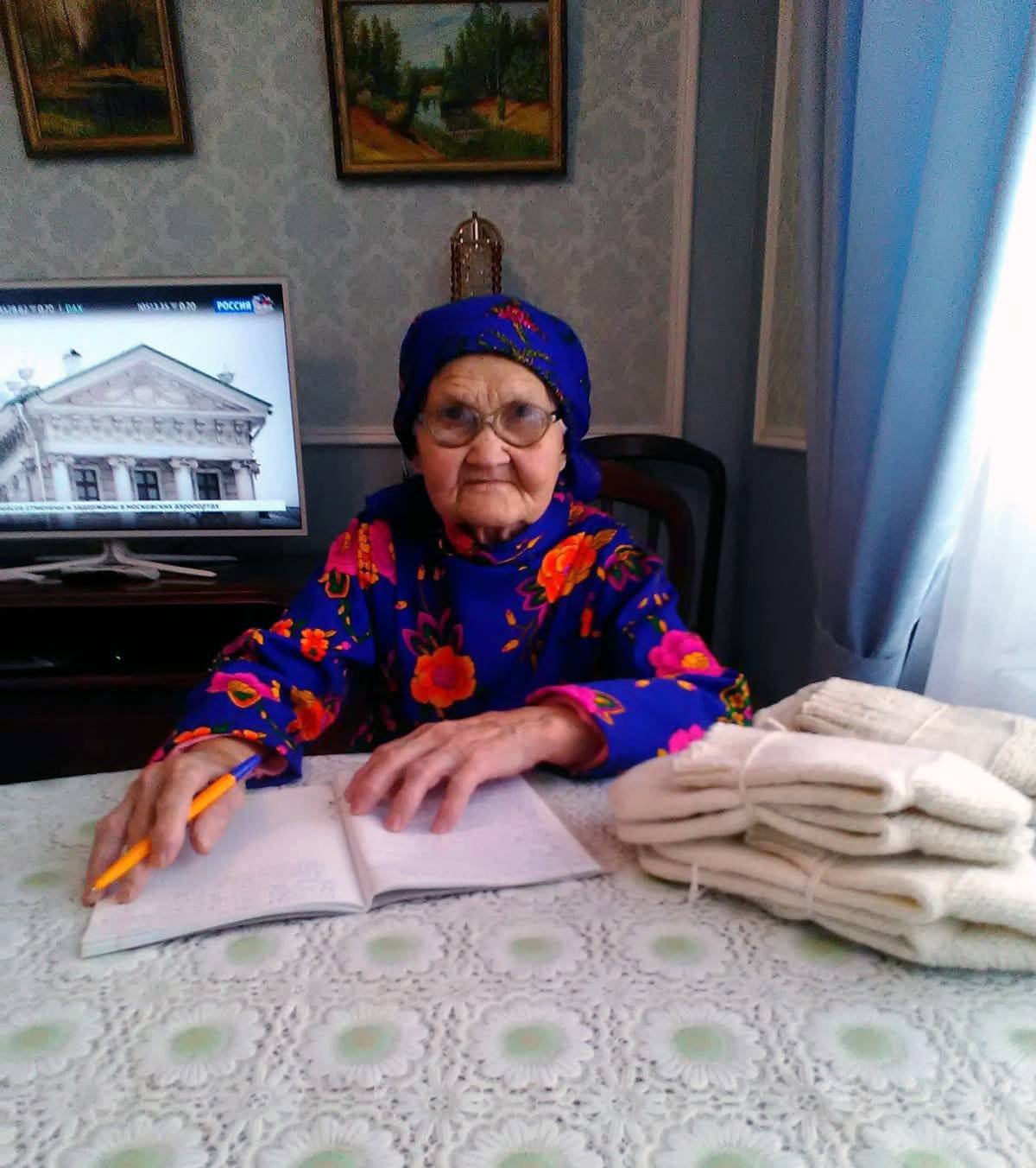 «Дорогие наши защитники: сыночки, внуки и правнуки. Я пережила военное время, перенесла холод и голод. В 1941 году мы уже отправляли на фронт посылки и письма. Девочки вязали носки, варежки, вышивали кисеты для махорки, писали письма. Мальчики сбивали ящики для посылок, делали рисунки на фронт. Вам очень и очень непросто. Хочется хоть чем-то помочь вам. И вот через 90 лет снова вяжу носки для солдат. Каждый носок вяжу с молитвой, с надеждой о помощи Господа. И, тепло моей души и рук помогут вам в борьбе. Знайте, что мы верим вашим справедливым действиям, надеемся на Победу и любим вас. Ждем возвращения домой живыми, невредимыми», – написала она в письме, которое отправила мобилизованным односельчанам вместе с теплыми вещами.