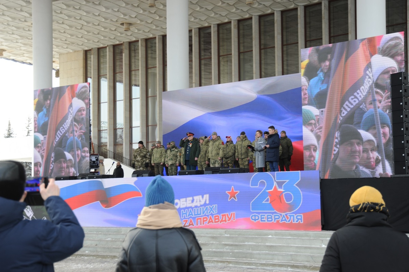 Сегодня, 22 февраля, на площади имени В. И. Ленина рядом с Русдрамтеатром в Уфе состоялся митинг-концерт, посвященный Дню защитника Отечества и поддержке российских военнослужащих – участников спецоперации на Украине.