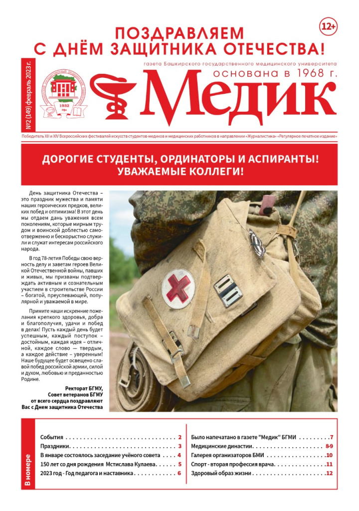 На сайт Башкирского государственного медицинского университета загружен свежий февральский номер газеты «Медик» №2 (149), посвященный 23 февраля - Дню защитника Отечества.
