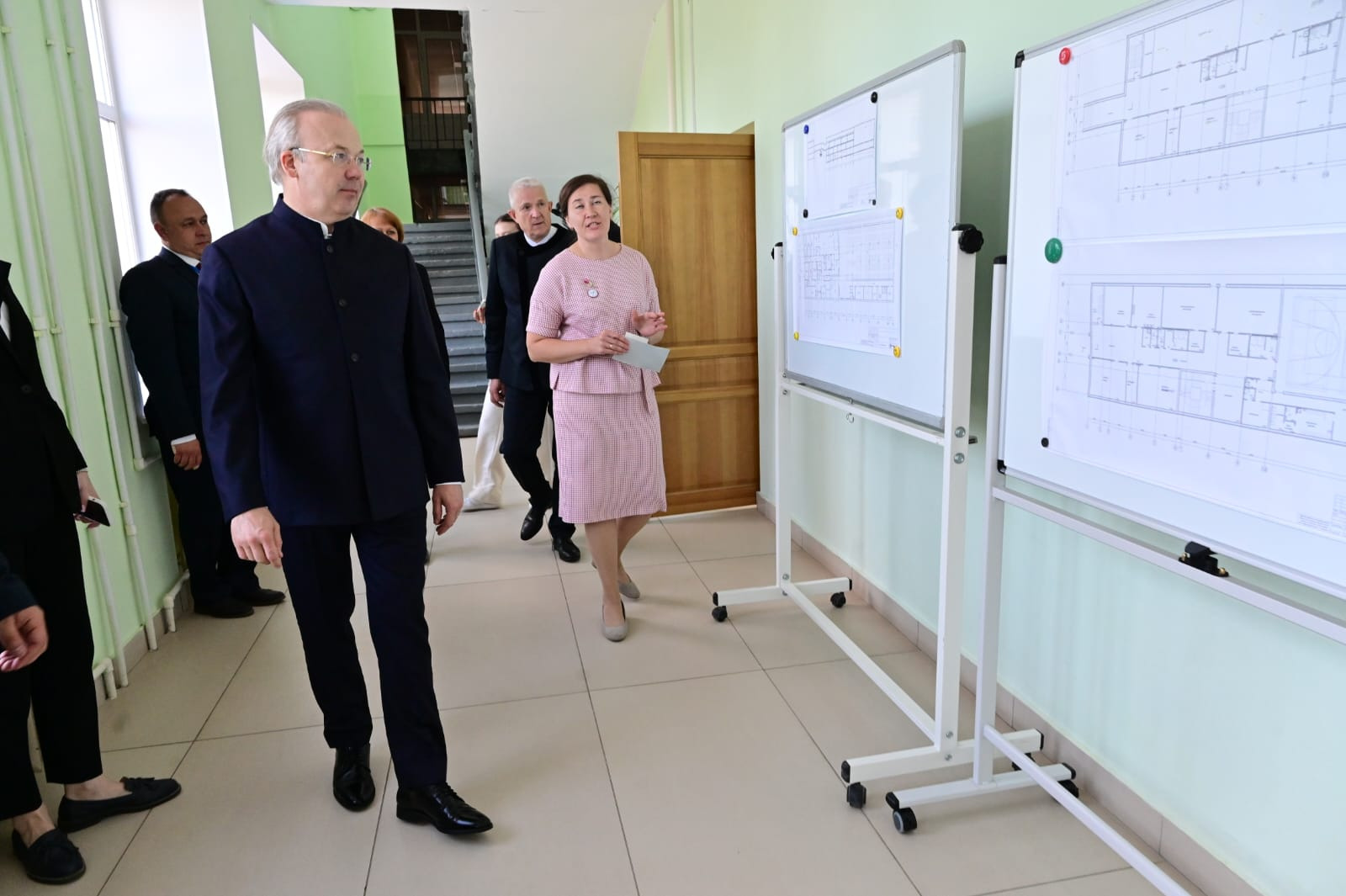 Премьер-министр ознакомился с проектом. Новый корпус, рассчитанный на 300 детей, будет соединяться с основным через теплый переход. На первом этаже расположится столовая с цехами, спортзал. На втором и третьем этажах разместятся учебные кабинеты, мастерские и библиотека.