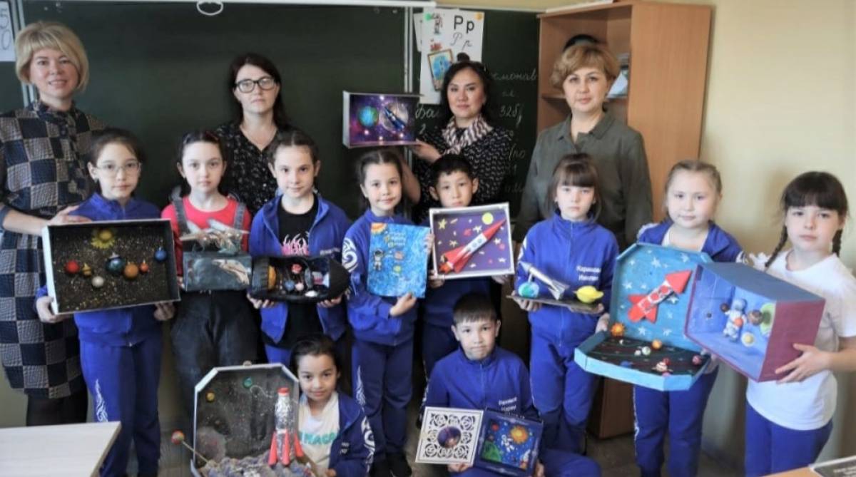 После обеда провели внеклассное мероприятие «Космос – это мы», а также поучаствовали в конкурсе от районного Дворца культуры «Ничего похожего на землю». Ребята подготовили работы из подручных средств.