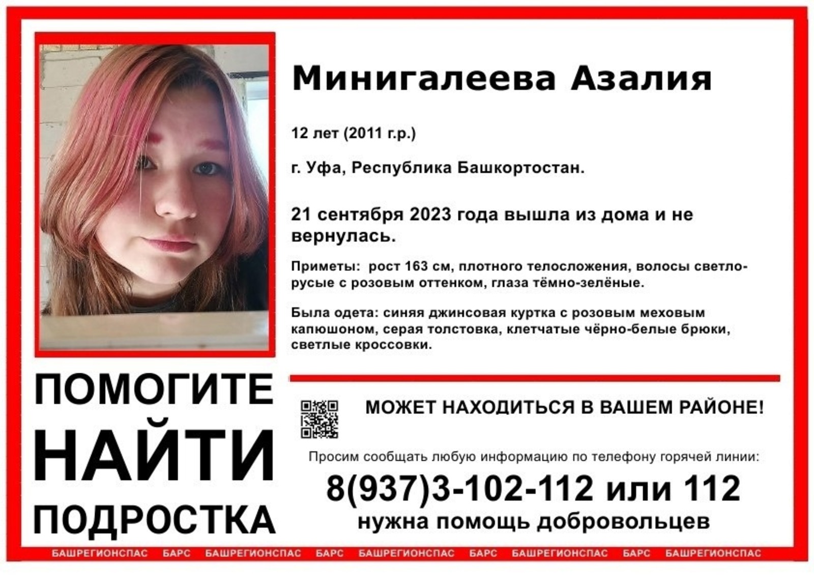 В Башкирии волонтеры в группе «БашРегионСпас» в соцсети «ВКонтакте» вечером 21 сентября сообщили о розыске пропавшей 12-летней девочки. Как выяснил « Башинформ », уфимка Азалия Минигалеева 21 сентября ушла из дома и не вернулась. Родные забили тревогу.