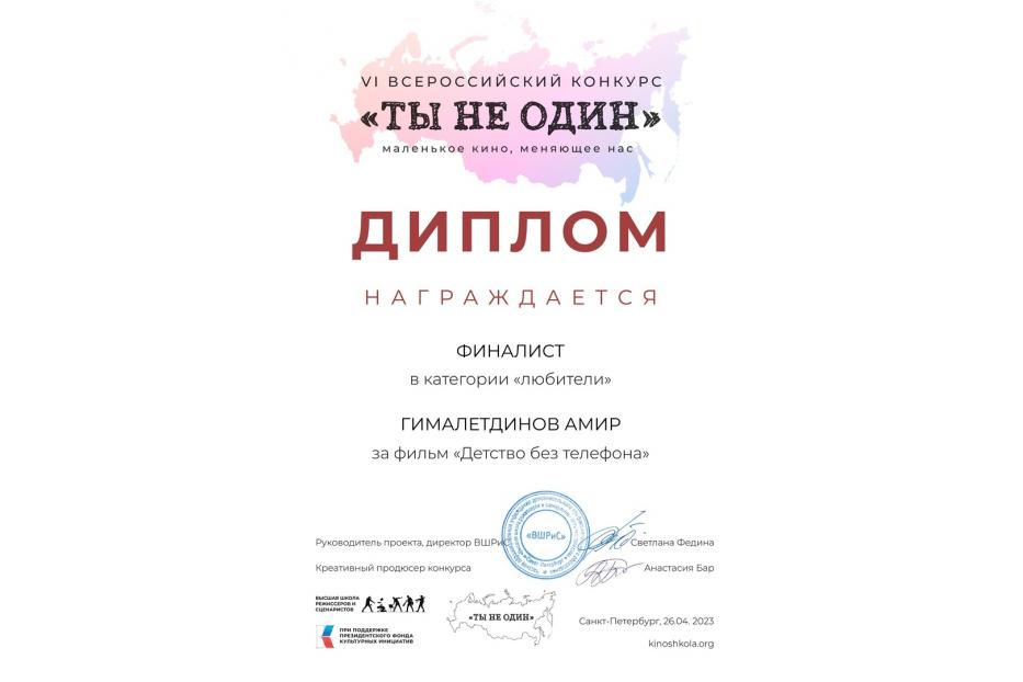 Он снял видеоролик «Детство без телефона» и стал победителем Всероссийского конкурса социальных роликов «Ты не один». Проекты конкурсантов оценивали эксперты Санкт-Петербургской «Высшей школы режиссеров и сценаристов киношколы».