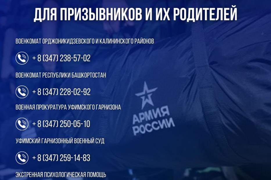 Телефон военкомата Орджоникидзевского и Калининского районов: + 8 (347) 238-57-02. В рабочие дни с 09:00 до 17:00. Телефон военкомата Республики Башкортостан: + 8 (347) 228-02-92. В рабочие дни с 09:00 до 17:00. Телефон военной прокуратуры Уфимского гарнизона: + 8 (347) 250-05-10. В рабочие дни с 09:00 до 18:00 Телефон Уфимского гарнизонного военного суда: + 8 (347) 259-14-83. В рабочие дни с 09:00 до 18:00 Телефон экстренной психологической помощи: + 8 (800) 7000-0183. КруглосуточноА если вы хотите поступить на службу по контракту, то можно обратиться в военкомат Орджоникидзевского и Калининского районов: ул. М. Горького, 70 (к. 216). Контактные телефоны: 242-86-53 (доб. 153), 240-54-02.