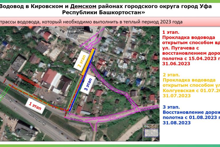 Работа по возведению объектов коммуникаций состоит из нескольких этапов. Один из них - строительство водовода в Кировском и Дёмском районах Уфы. Водовод будет проложен в том числе и вдоль улиц Пугачёва и Колгуевской. Строительно-монтажные работы запланированы открытым способом.