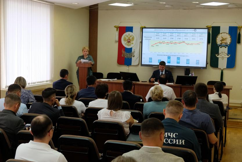 С докладом «О работе с обращениями граждан в I полугодии 2023 г. в Администрации Кировского района Уфы выступила начальник отдела по работе с обращениями и делопроизводству Гузель Хусаинова.