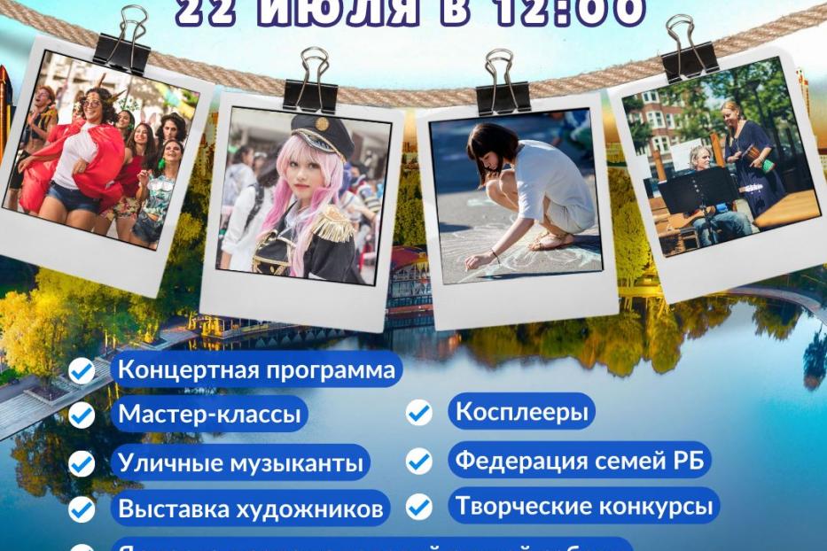 На территории парка гостей ожидают выступления уличных музыкантов, выставка художников, мастер-класс по рисованию, ярмарка изделий ручной работы, акция от Федерации семей республики. Также на сцене состоятся выступления вокалистов, сольные и парные танцы, показ коллекций одежды от уфимских дизайнеров.