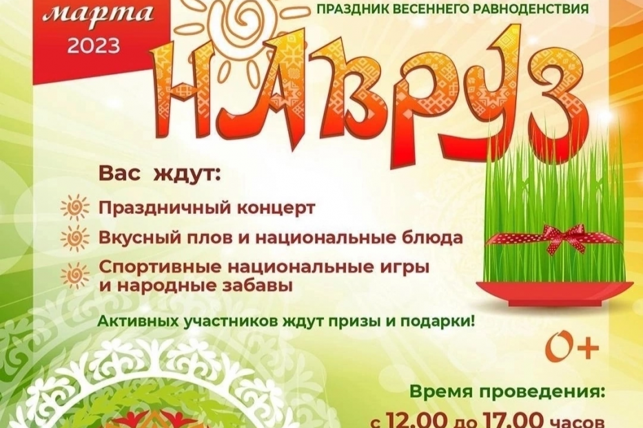 19 марта в Уфе на площади агропарка «ЕврАзия» пройдет Республиканский праздник весеннего равноденствия «Навруз», гости которого смогут поближе познакомиться с народами, проживающими на территории Башкортостана. Национальную культуру и обычаи продемонстрируют башкиры, татары, таджики, узбеки, туркмены, азербайджанцы, дагестанцы, казахи. На площади агропарка разместятся дворики-юрты. Около каждого подворья будут расположены столы с блюдами национальной кухни. Всех желающих угостят праздничным пловом.
