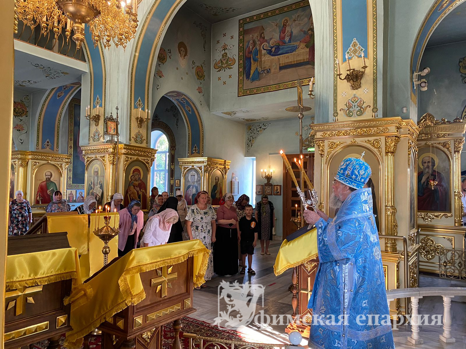 06 августа 2023г., в Неделю 9-ю по Пятидесятнице и день памяти мчч. блгвв. кнн. Бориса и Глеба, во Святом Крещении Романа и Давида, митрополит Уфимский и Башкортостанский НИКОН возглавил Божественную литургию в Михаило-Архангельском храме п.Рощинский Стерлитамакского р-на. Владыке сослужил игумен Силуан (Филиппов) и настоятель прихода иерей Артемий Алексеев. Диаконский чин возглавил первый соборный протодиакон Максим Коробицын.