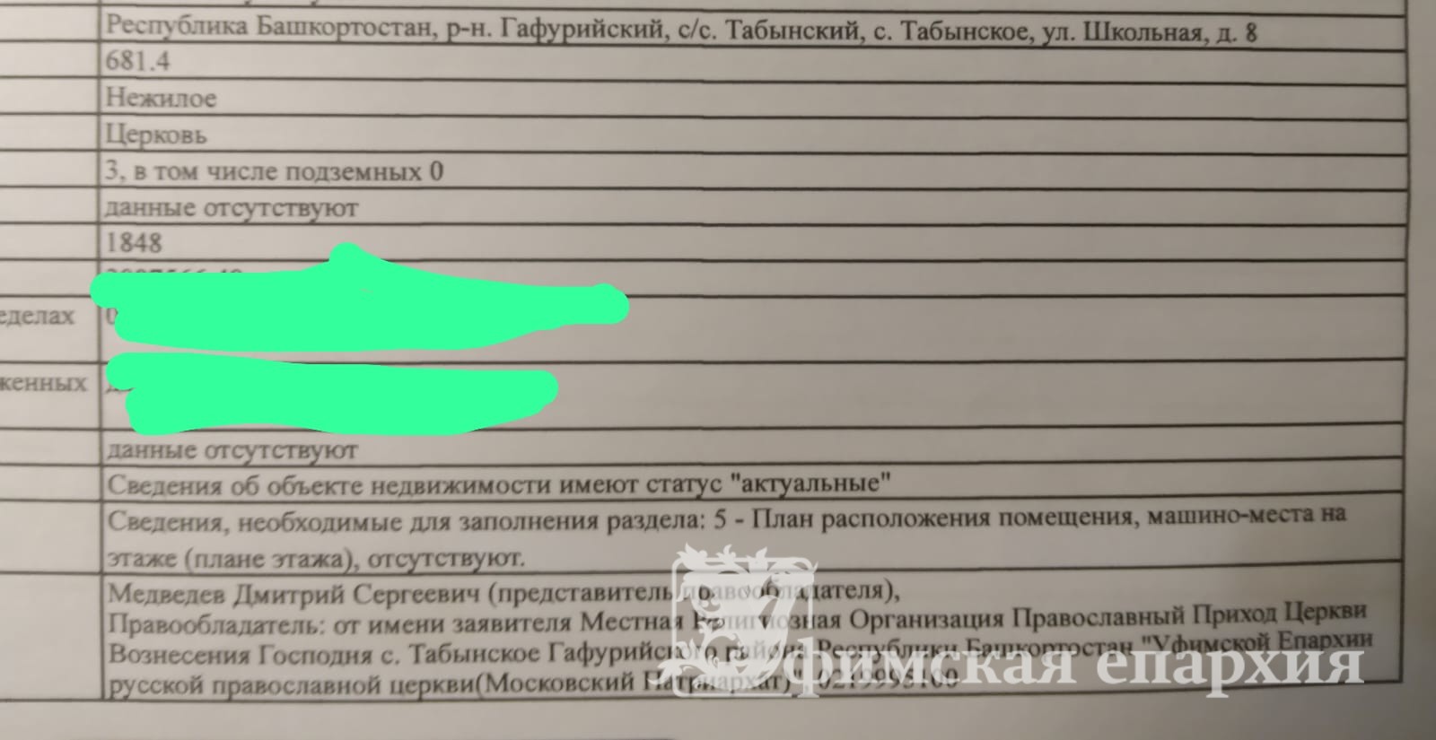 13 февраля 2020 года, на имя главы администрации Гафурийского района, было направлено письмо , с просьбой утвердить схему расположения земельного участка на кадастровом плане и предоставить в безвозмездное пользование земельный участок расположенный по адресу: РБ, с. Табынское, Школьная 8, На это письмо получен ответ с отказом, в связи с расположением на данном участке объекта недвижимости (здания церкви). Здание церкви не было никаким образом оформлено.