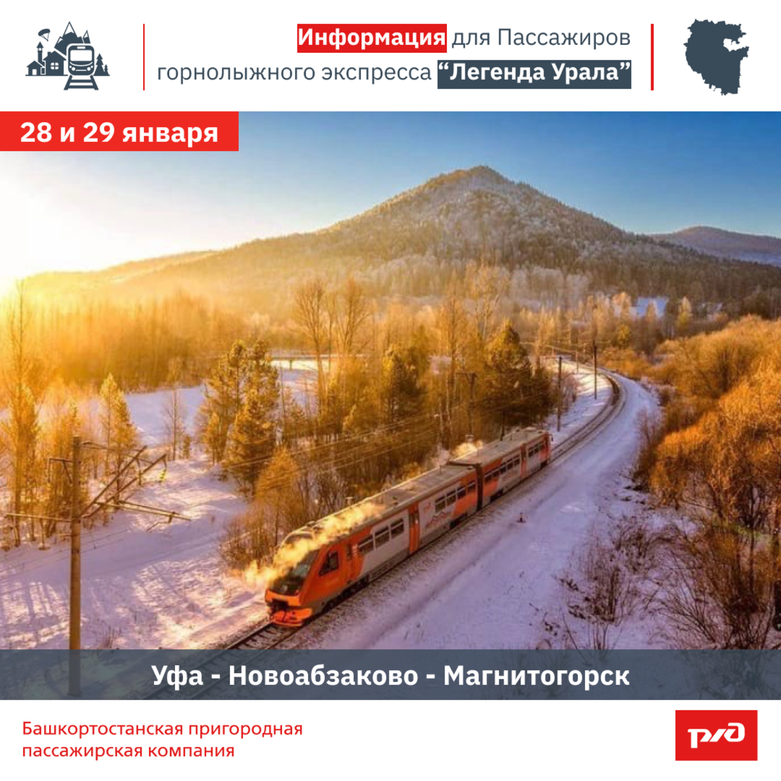 Башкортостанская пригородная пассажирская компания объявила о дополнительных рейсах по маршруту Уфа – Новоабзаково – Магнитогорск. Это сделано для удобства граждан, желающих побывать на горнолыжных курортах. Провоз спортивного инвентаря бесплатный. Для школьников и студентом предусмотрена скидка 50 процентов.