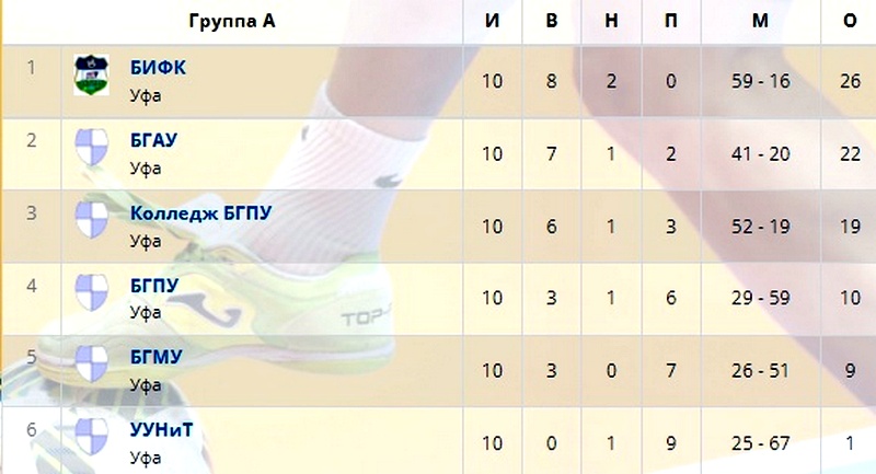 Завершался Чемпионат игрой между командами БИФК и БГАУ. В начале второго тайма хозяева площадки команда БГАУ вели в счёте 3:0. БИФК счёт сравнял. Аграрники забивают четвертый гол. Физкультурники вновь его сравнивают. 4:4.Символично, что последний гол Чемпионата забил лучший его бомбардир, студент 4 курса Башкирского института физической культуры Артур Гареев.
