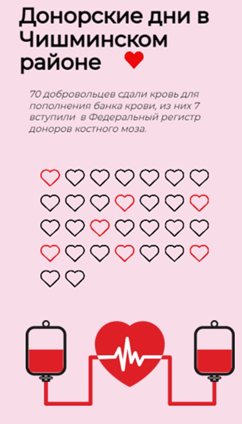 С 27 по 28 февраля прошли донорские дни в Чишминском районе, за два дня приняли 70 доноров, из них 7 человек вступили в Федеральный регистр доноров костного мозга. Благодарим всех за желание стать донором, сдать 450 мл. крови.
