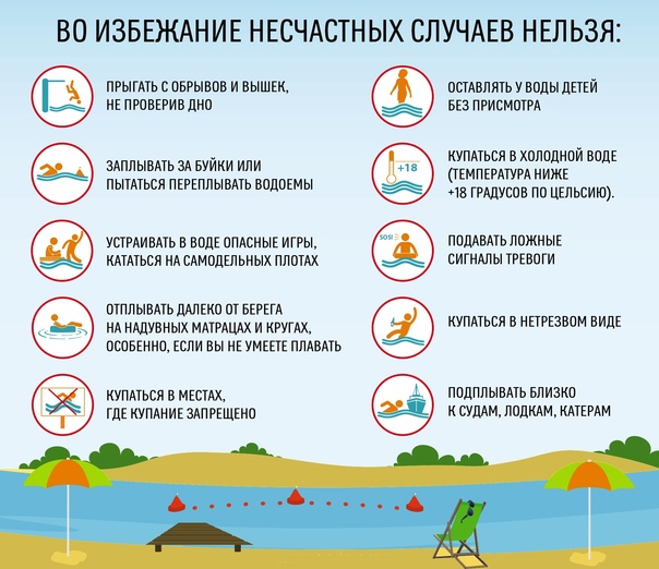 - Не следует входить в воду уставшим, разгоряченным или вспотевшим.