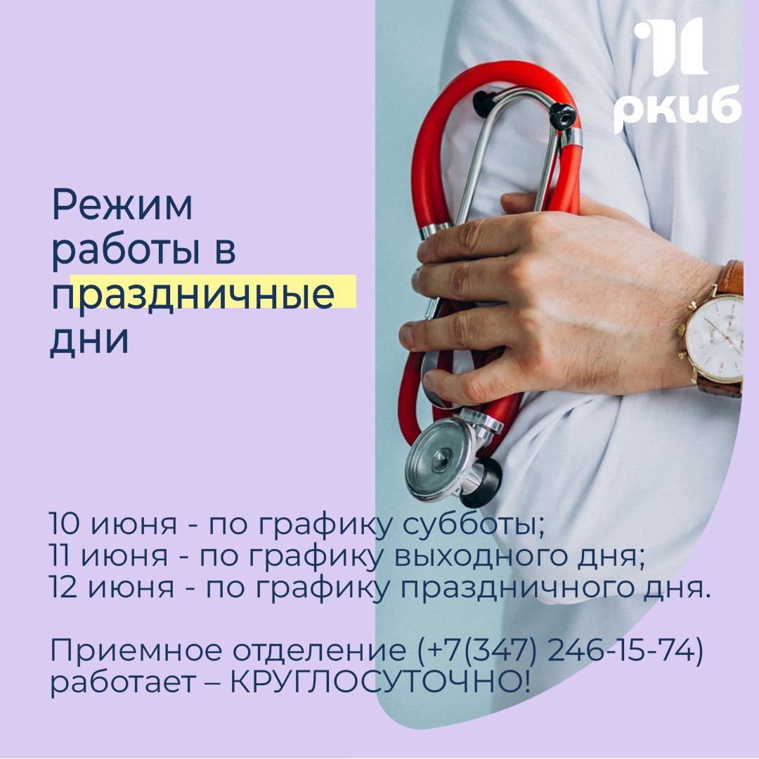 - 10 июня - по графику субботы; - 11 июня - по графику выходного дня; - 12 июня - по графику праздничного дня. Приемное отделение (+7(347) 246-15-74) работает – КРУГЛОСУТОЧНО!