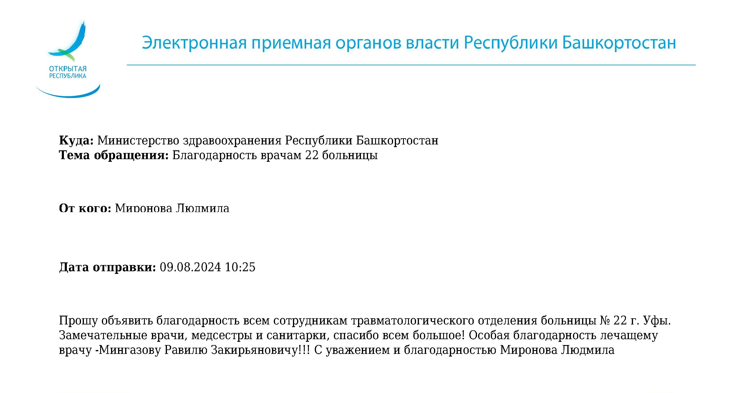 Сотрудники отделения травматологии, включая врача-травматолога Мингазова Равиля Закирьяновича, выражают свою искреннюю благодарность всем пациентам за теплые слова поддержки. Каждое ваше сообщение и отзыв очень важны для нас и вдохновляют на дальнейшую работу.
