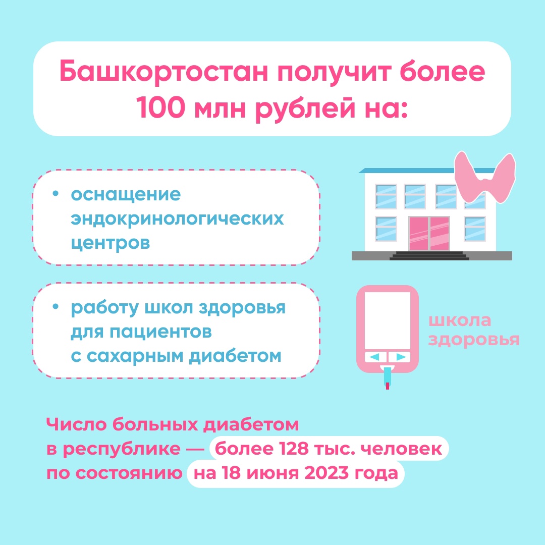 Башкортостан – один из 36 регионов, которым выделят средства на создание и оснащение эндокринологических центров, а также на работу школ здоровья для пациентов с сахарным диабетом.