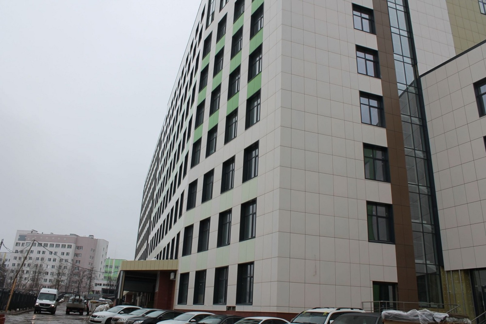 В новом здании разместятся приемное отделение с диагностическими кабинетами, поликлиника, операционные блоки с реанимацией, отделения рентгенохирургии и кардиохирургии, административный блок и аптечно-распределительный пункт.